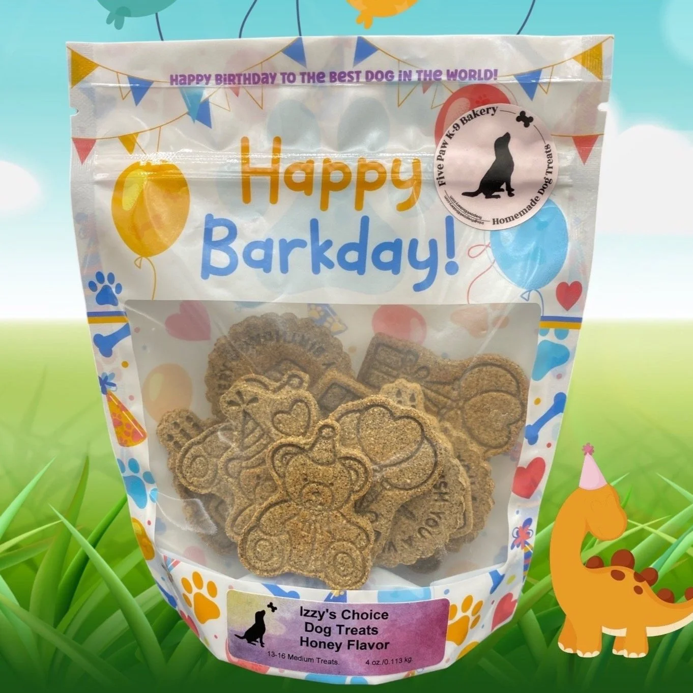 Say “Happy Birthday” to a special pup with this bag of birthday shaped dog treats. Grain Free Honey Flavored Dog Treats.